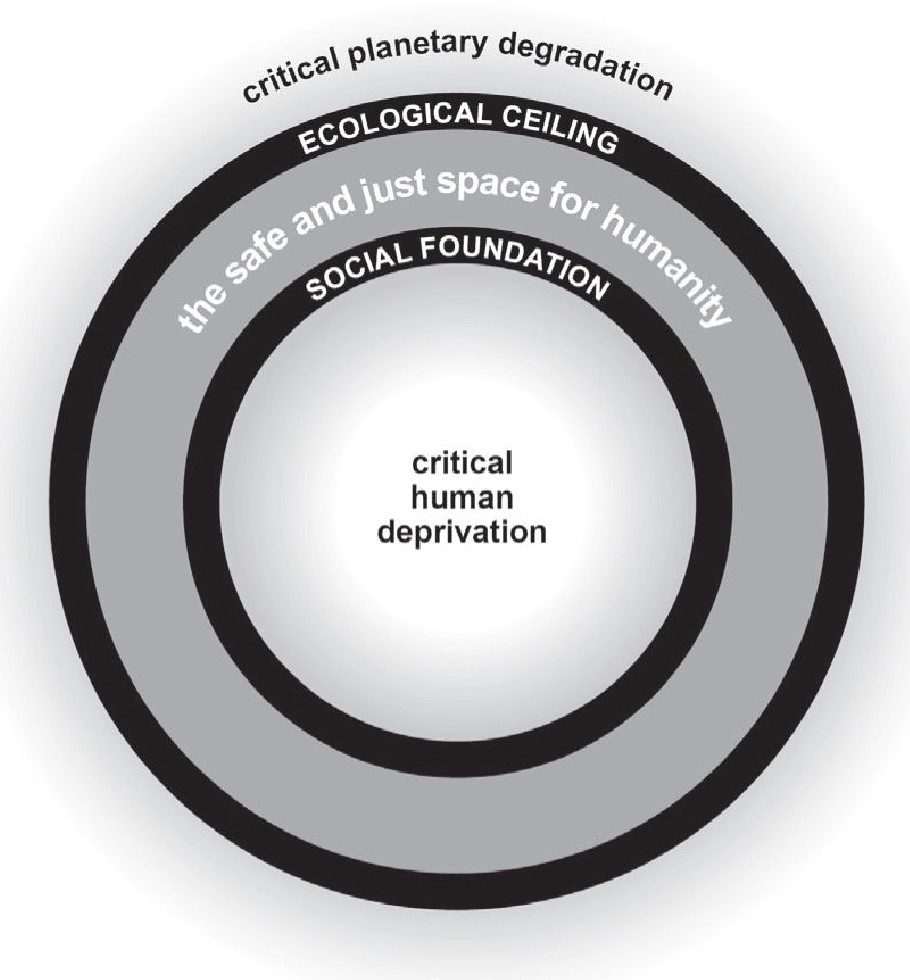 Bentuk “donat” dalam model ini merujuk pada dua lingkaran. Lingkaran dalam adalah pondasi sosial, menggambarkan standar minimum bagi kehidupan manusia seperti makanan, pendidikan, perumahan, dan keadilan politik. Apabila kita berada dibawah batas fondasi sosial maka hak-hak kita sebagai manusia belum dapat dipenuhi. Negara harus memenuhi hak-hak ini. Lalu Lingkaran luar adalah batas ekologi planet, lebih mudahnya adalah daya dukung dan daya tampung lingkungan hidup. Jika kita melewati lingkaran luar ini, maka aktifitas yang kita lakukan akan berdampak negatif pada Bumi.